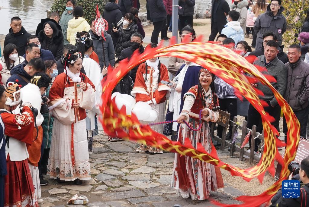 1月23日,演員在盱眙第一山歷史文化街區甩龍。