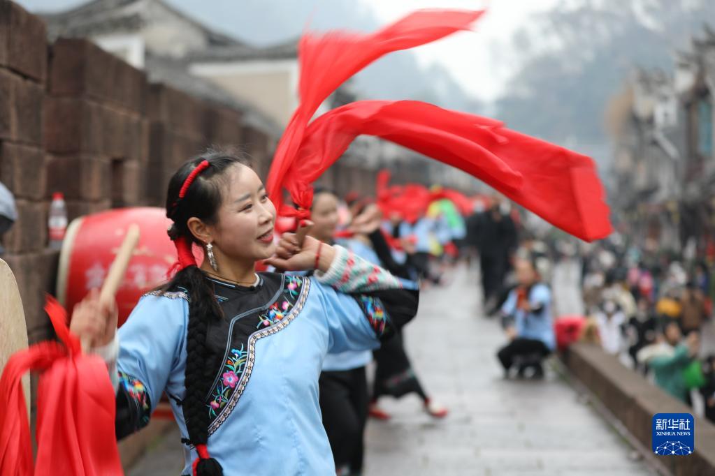 1月23日,在湖南省湘西土家族苗族自治州鳳凰古城,演員在進(jìn)行苗鼓表演。