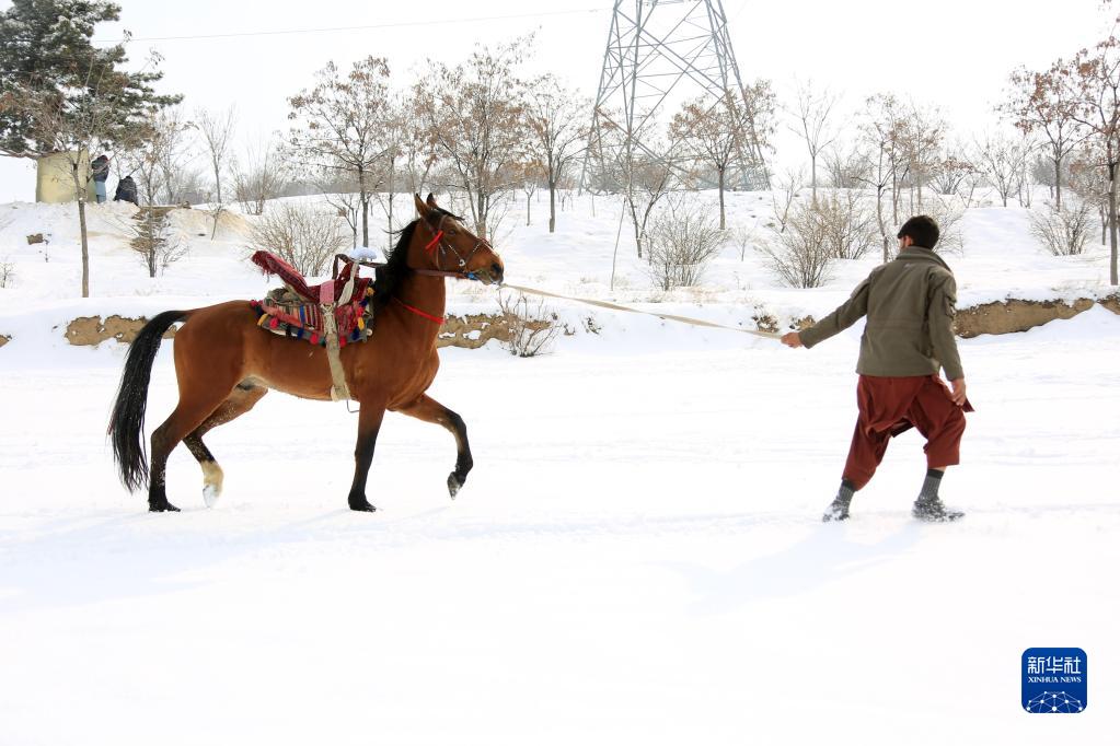 1月23日,在阿富汗首都喀布爾,一名男子牽馬從雪地上走過(guò)。