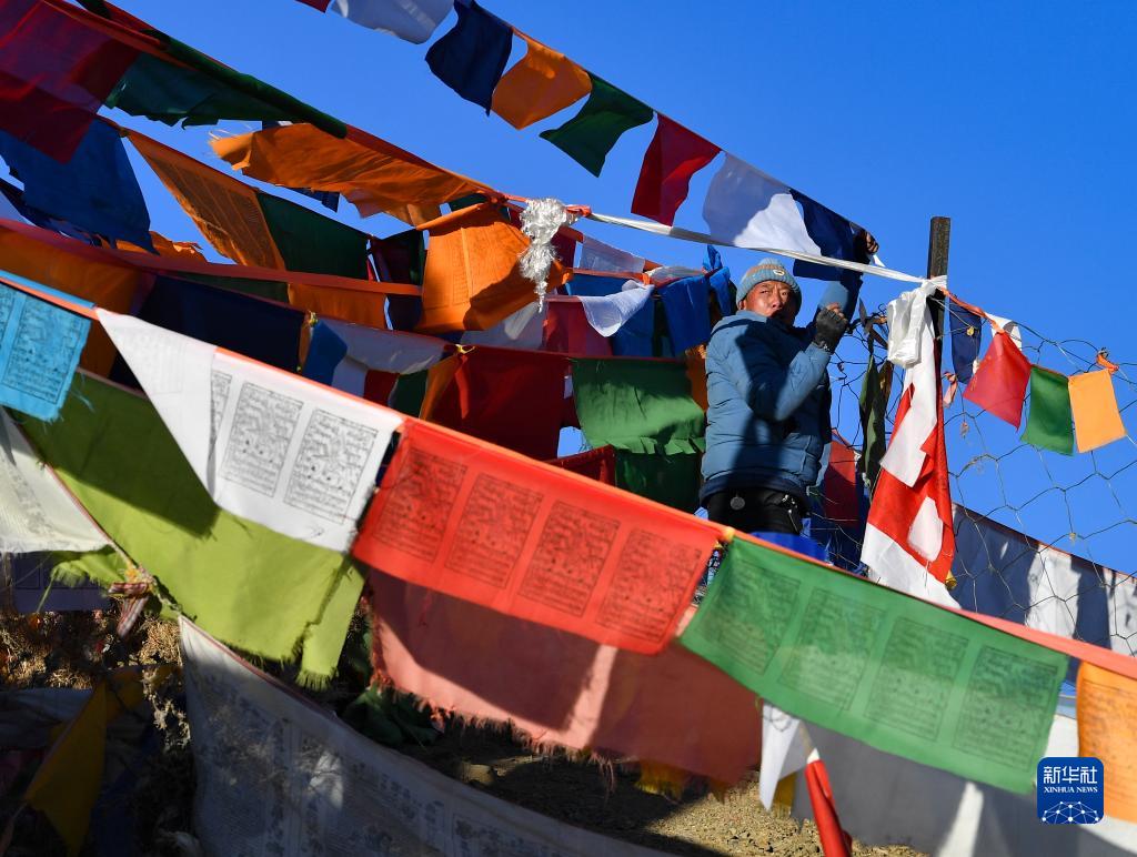 1月24日,日喀則市桑珠孜區的藏族群眾在山上懸掛五彩經(jīng)幡。