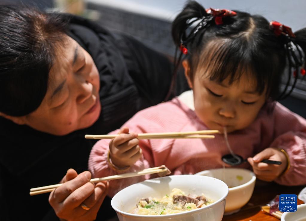 1月24日,游客在西安市回民街一家餐館品嘗羊肉泡饃。