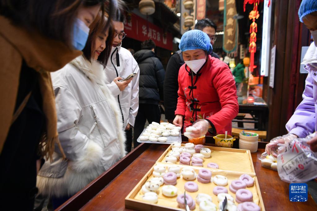 1月24日,在位于陜西省咸陽(yáng)市的福園巷子街區,顧客選購剛制作好的米糕。