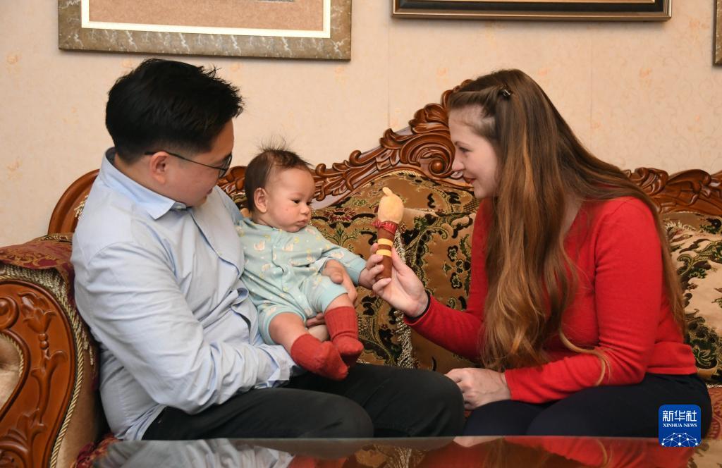 張珍妮(右)與丈夫在北京的家中照顧孩子(1月12日攝)。