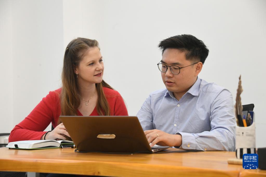 在北京中德產(chǎn)業(yè)園,張珍妮(左)與丈夫張鼎然在辦公室交流工作(1月12日攝)。