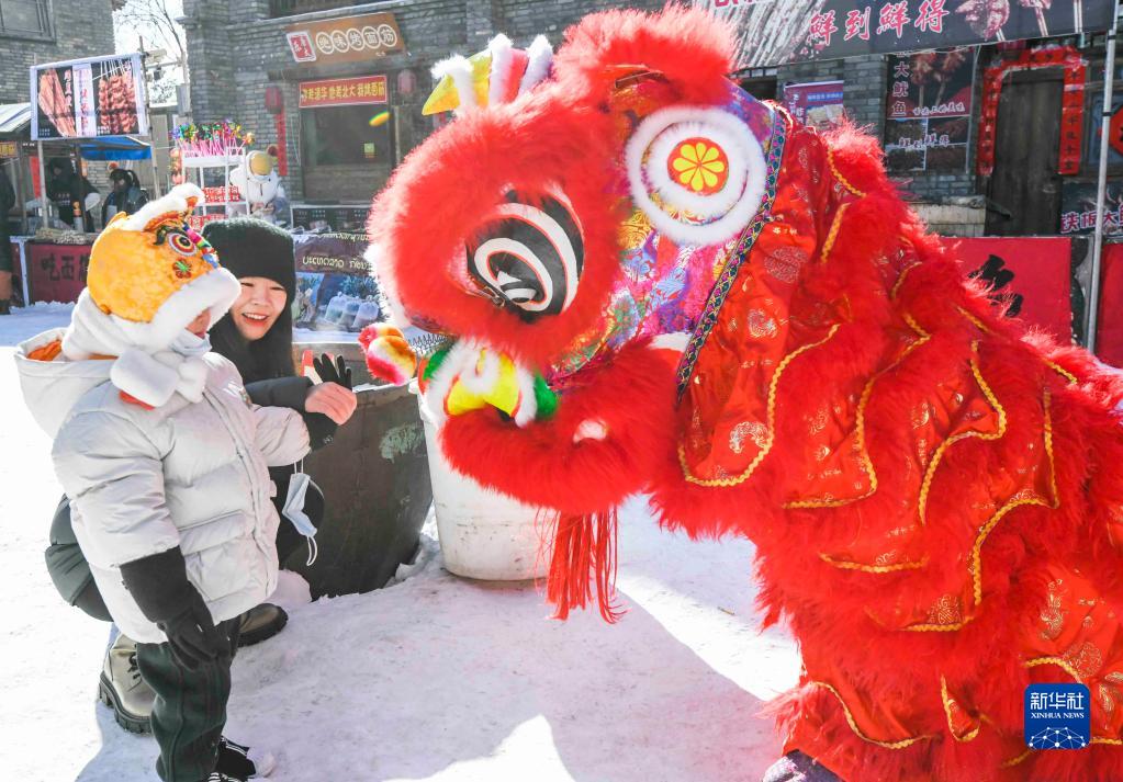 1月24日,在位于河北省遵化市的唐山尚禾源旅游景區,舞獅演員與一名小游客互動(dòng)。