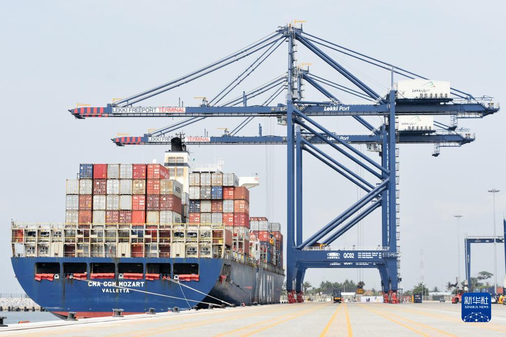 1月23日,在尼日利亞拉各斯,一艘滿(mǎn)載集裝箱的貨輪停泊在萊基深水港。