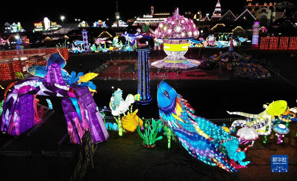 1月24日在青島金沙灘啤酒城內拍攝的海洋主題彩燈(無(wú)人機照片)。