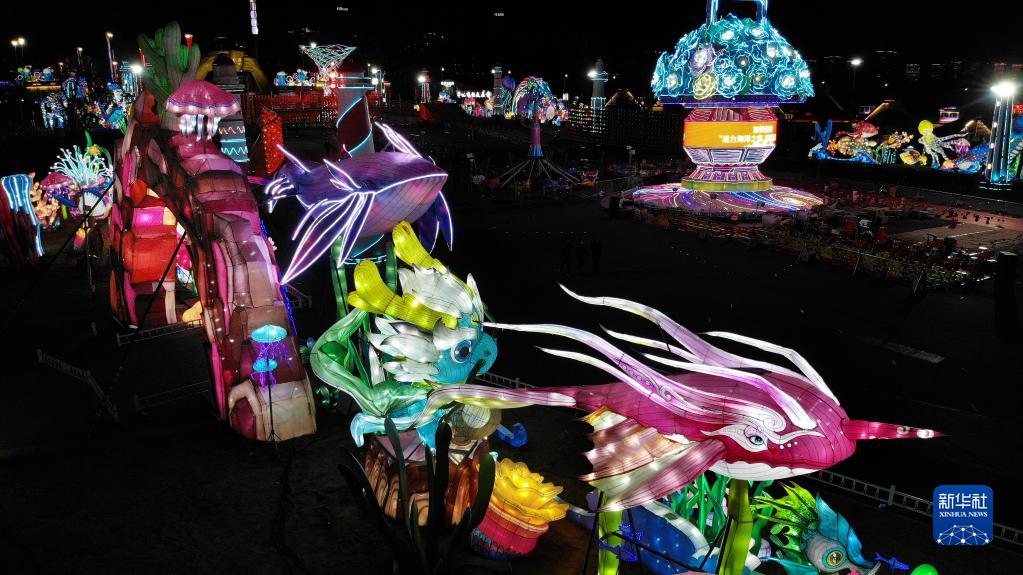 1月24日在青島金沙灘啤酒城內拍攝的海洋主題彩燈(無(wú)人機照片)。