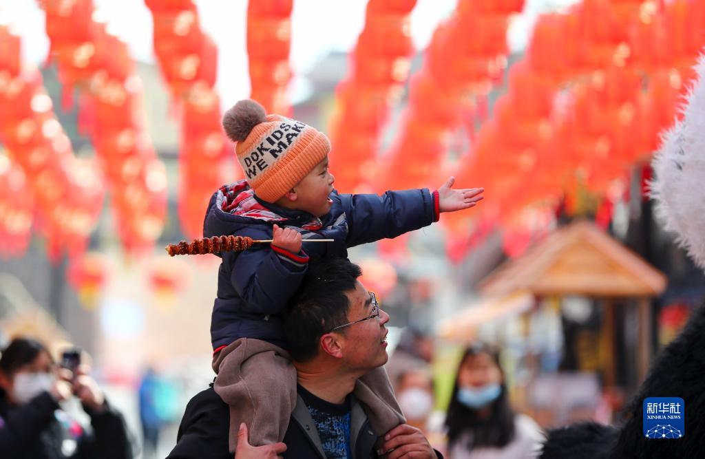 1月25日,家長(cháng)帶著(zhù)孩子在山東省棗莊市薛城區鐵道游擊隊景區逛廟會(huì )。