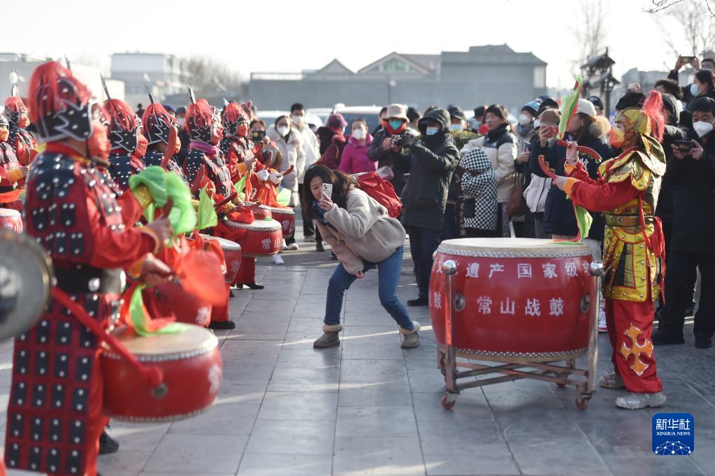 1月25日,在河北省石家莊市正定古城隆興寺景區的傳統文化演出上,游客欣賞“常山戰鼓”。