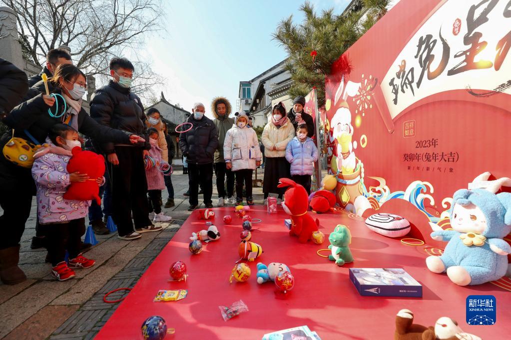 1月24日,游客在蘇州黎里古鎮玩套圈游戲。