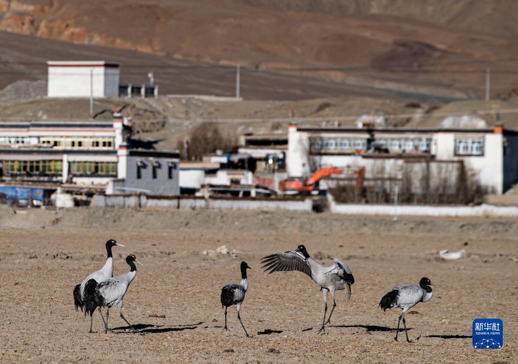在西藏雅魯藏布江中游河谷黑頸鶴國家級自然保護區日喀則片區拉孜縣附近,大量越冬的黑頸鶴翩翩起舞,迎接春天的到來(lái)。
