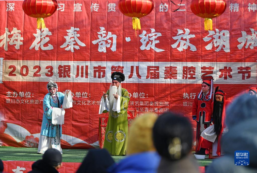 1月25日,演員在寧夏銀川市賀蘭縣潤園文化廣場(chǎng)為戲迷表演秦腔劇目《烙碗記》。