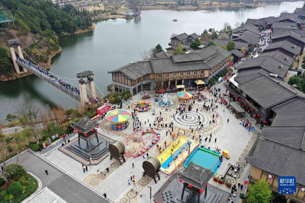 1月25日,游客在貴州省丹寨縣萬(wàn)達小鎮景區的“新春廟會(huì )”游玩(無(wú)人機照片)。