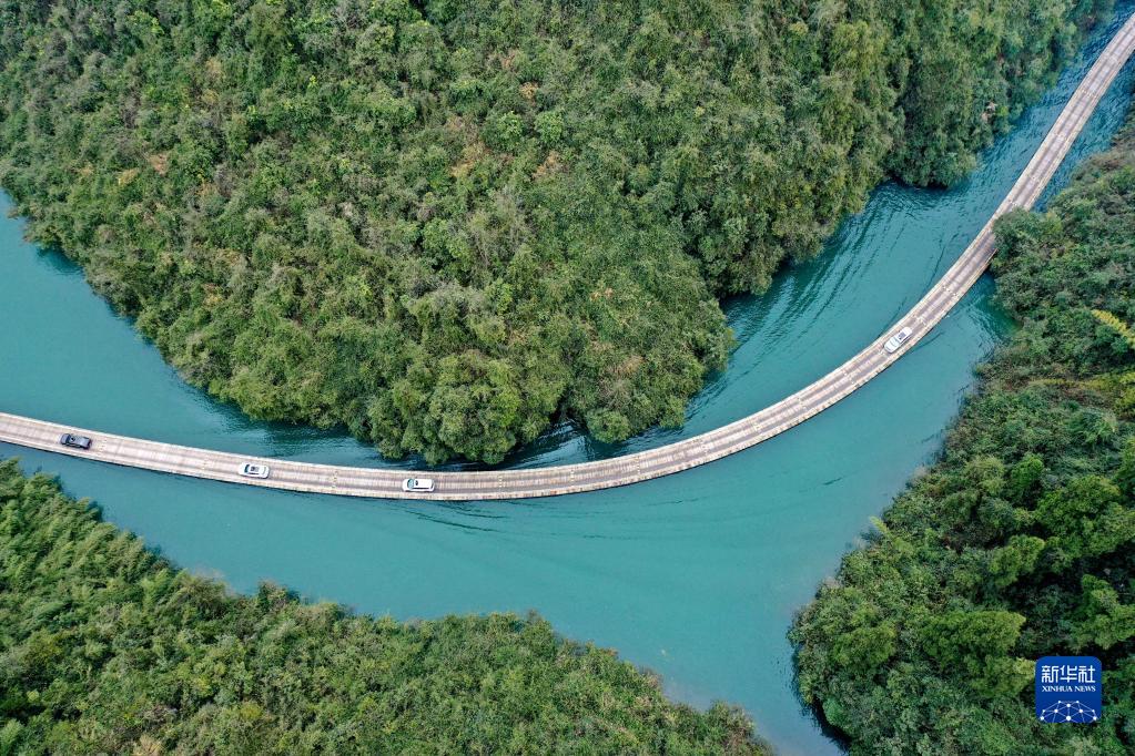 1月25日,人們在湖北省恩施土家族苗族自治州宣恩縣獅子關(guān)景區的一段水上漂浮公路上駕車(chē)游玩(無(wú)人機照片)。