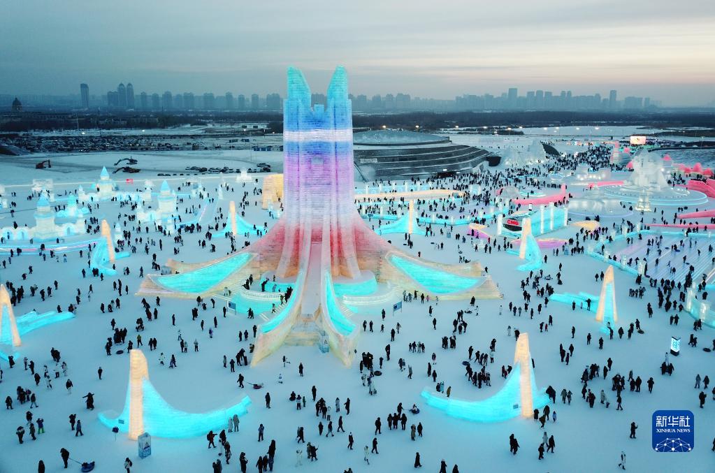 1月25日,游客在哈爾濱冰雪大世界園區內游玩(無(wú)人機照片)。