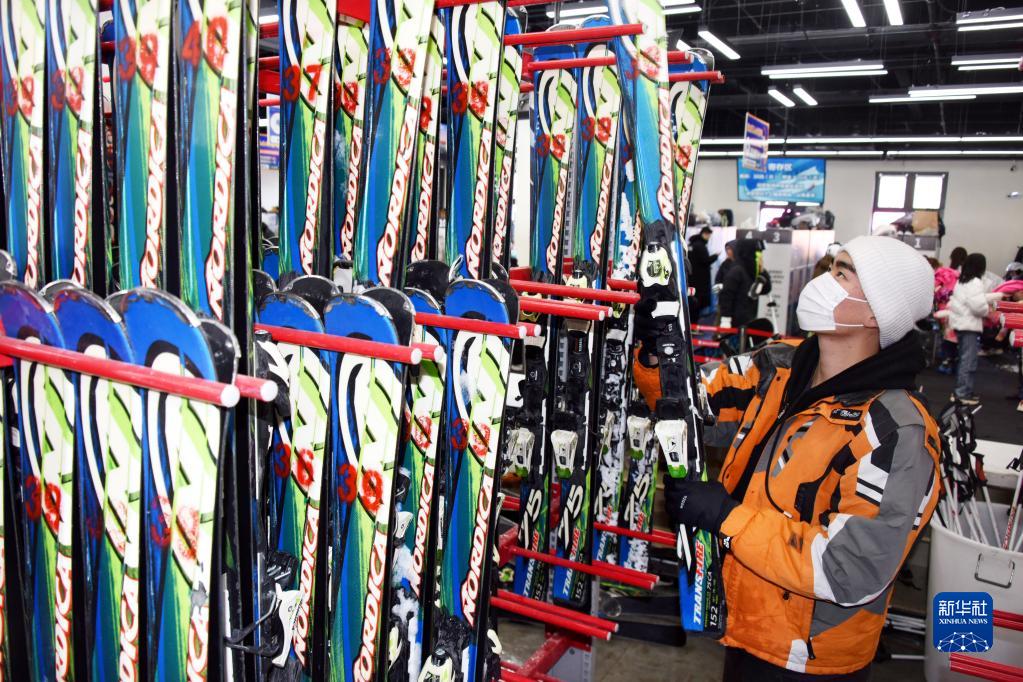 1月25日,青島西海岸新區藏馬山滑雪場(chǎng)工作人員在為游客摘取雪具。