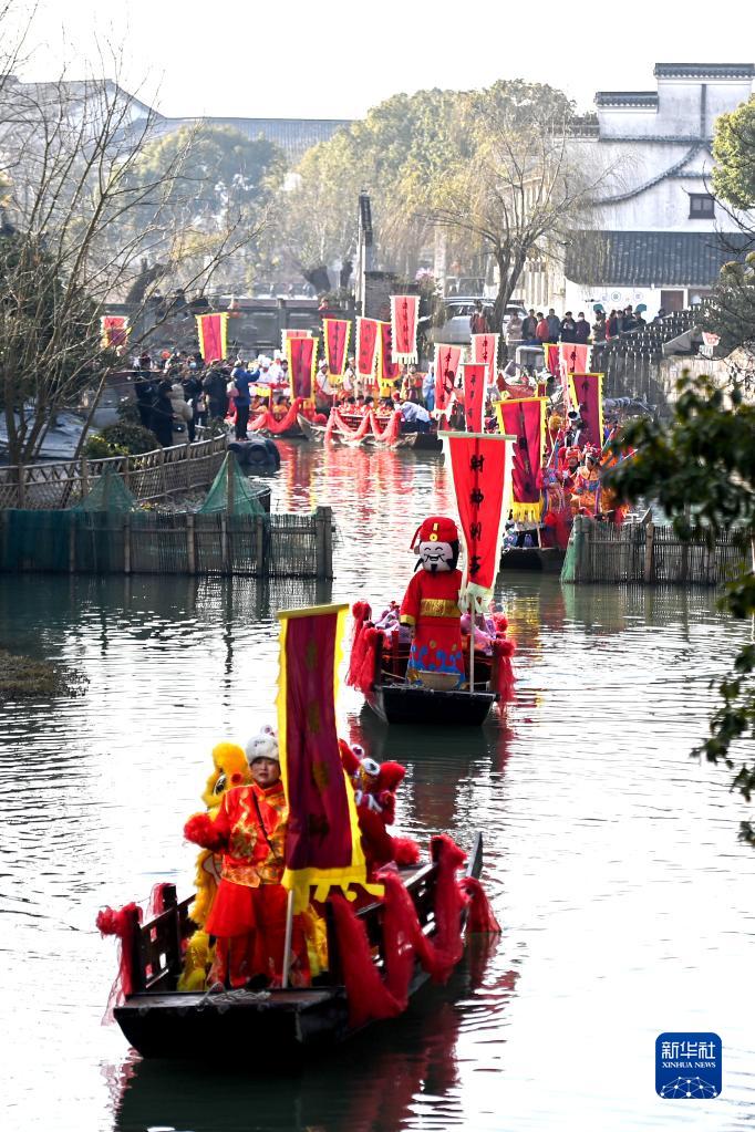 1月26日,在浙江省湖州市南潯區和孚鎮荻港村,載有200多位村民的24條漁船在水上古道巡游。