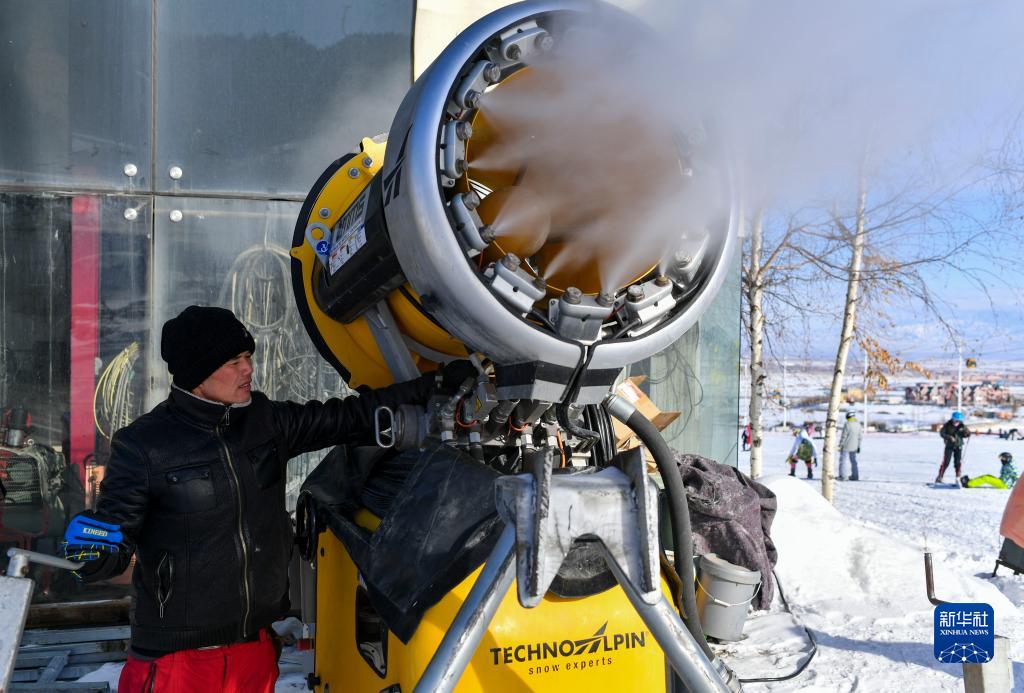 37歲的阿布力哈孜·朱木朱瑪在新疆絲綢之路國際度假區調試造雪設備(1月25日攝)。他來(lái)自度假區附近的東梁村,在此工作已有四年,夏天參與文旅演出,冬季在雪場(chǎng)上班。