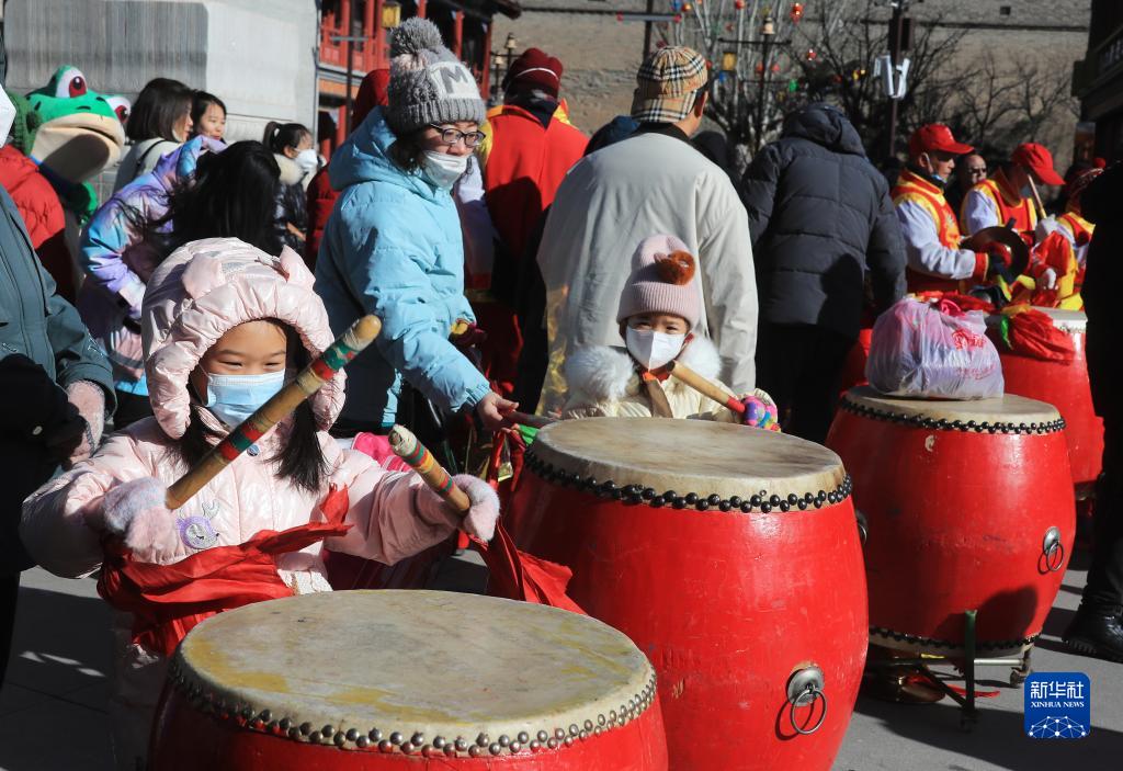 1月26日,小朋友在大境門(mén)廟會(huì )上敲鼓。