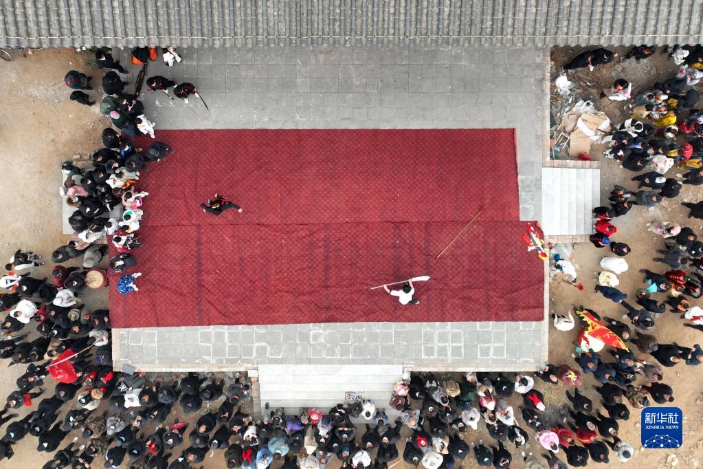 1月26日,梅花拳愛(ài)好者在平鄉縣油召鄉八辛莊村進(jìn)行梅花拳器械對練(無(wú)人機照片)。