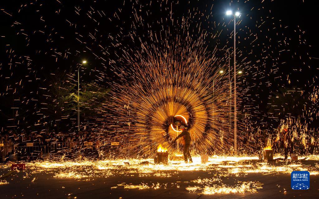 當晚,廣東省揭陽(yáng)市上演了一場(chǎng)精彩的“打鐵花”非遺表演活動(dòng),吸引了大量市民和游客前來(lái)觀(guān)賞,營(yíng)造出濃郁的節日氛圍。