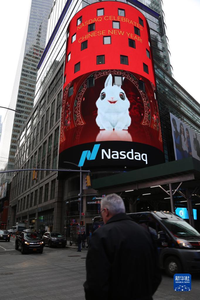 美國納斯達克交易所與中國駐紐約總領(lǐng)館25日共同舉行線(xiàn)下敲鐘儀式,慶祝中國農歷兔年的到來(lái)。位于紐約時(shí)報廣場(chǎng)的納斯達克交易所巨型電子屏幕直播敲鐘儀式并播放有關(guān)中國春節的視頻短片。