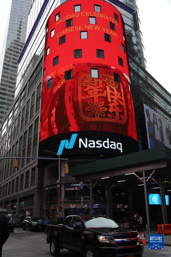 美國納斯達克交易所與中國駐紐約總領(lǐng)館25日共同舉行線(xiàn)下敲鐘儀式,慶祝中國農歷兔年的到來(lái)。位于紐約時(shí)報廣場(chǎng)的納斯達克交易所巨型電子屏幕直播敲鐘儀式并播放有關(guān)中國春節的視頻短片。