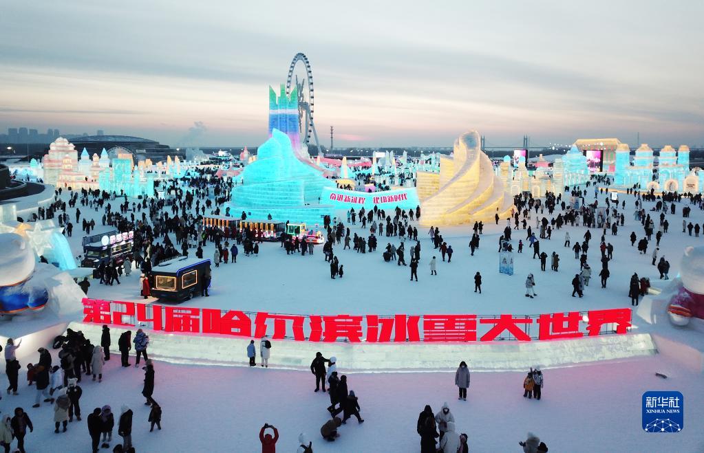 1月25日,游客在哈爾濱冰雪大世界園區游玩(無(wú)人機照片)。