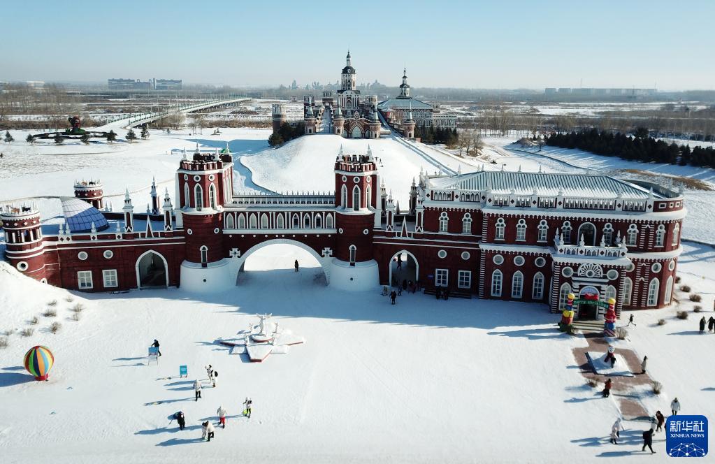 1月26日,游客在哈爾濱伏爾加莊園體驗冰雪娛樂(lè )項目(無(wú)人機照片)。