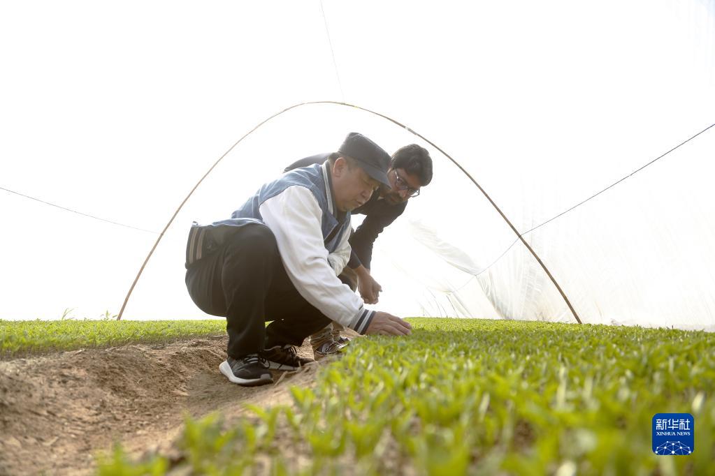 1月16日,在位于巴基斯坦旁遮普省木爾坦的中巴辣椒訂單種植項目辣椒育苗大棚內,中國農業(yè)專(zhuān)家趙建華(前)帶領(lǐng)巴基斯坦技術(shù)員薩賈德查看辣椒秧苗生長(cháng)情況。