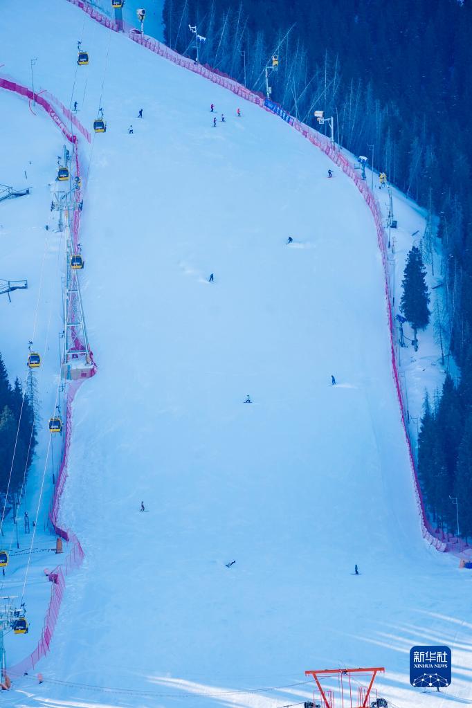 滑雪愛(ài)好者在絲綢之路國際滑雪場(chǎng)一處雪道上滑雪(1月25日攝)。