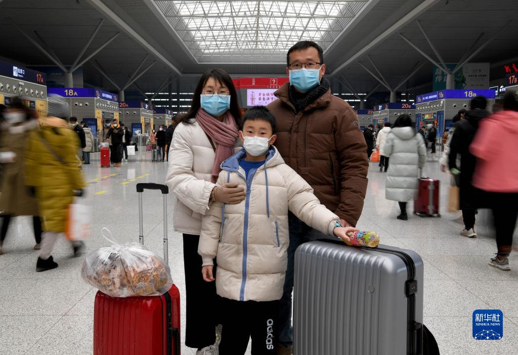 河南省信陽(yáng)市浉河區董家河鄉高嶺村人劉紅善(右)和愛(ài)人傅雪梅、兒子劉宇辰在鄭州東站候車(chē)大廳內候車(chē),準備去往廣州(1月26日攝)。劉紅善在廣州已經(jīng)工作了6年,近3年都沒(méi)能回老家過(guò)春節,今年專(zhuān)門(mén)回家陪老父親過(guò)節。
