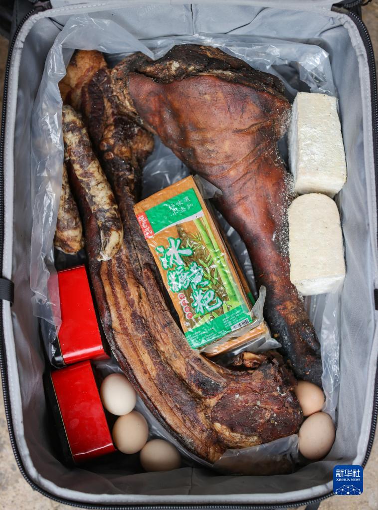 彭沙行囊里裝的物品(1月26日攝)。彭沙行囊里裝著(zhù)父母親手制作的臘肉、臘豬腳、香腸、茶葉、石灰豆腐、咸蛋及當地特色小吃冰糖黃粑等。