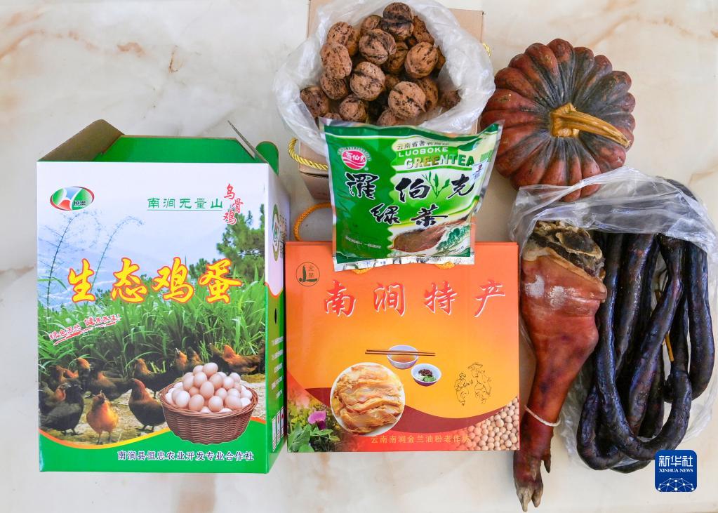 云南省大理白族自治州南澗彝族自治縣小灣東鎮紙房村人蘭云婭即將裝進(jìn)行囊里的物品(1月26日攝),有父母親手腌制的臘肉香腸、南澗土特產(chǎn)生態(tài)土雞蛋、南澗鍋巴油粉和茶葉等。