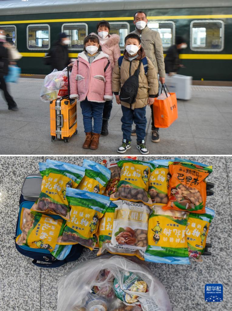 拼版照片:上圖為嫁到甘肅省岷縣的新疆呼圖壁縣人汪元芳(后左一)一家在新疆烏魯木齊站準備乘坐火車(chē)前往甘肅。時(shí)隔兩年,汪元芳帶著(zhù)全家人回到新疆呼圖壁縣,在娘家度過(guò)2023年的春節(1月26日攝)。下圖為汪元芳一家行囊里裝的物品。除了在火車(chē)上的吃食外,汪元芳的父母還給他們裝了葡萄干、核桃、大棗等新疆特色干果(1月26日攝)。