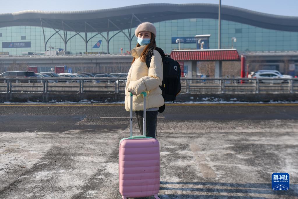 新疆女孩戴詩(shī)蕊在新疆烏魯木齊地窩堡國際機場(chǎng)T3航站樓前,準備乘飛機前往北京(1月26日攝)。大學(xué)畢業(yè)后就留在北京工作的她每年過(guò)年都會(huì )回到烏魯木齊和家人團聚。