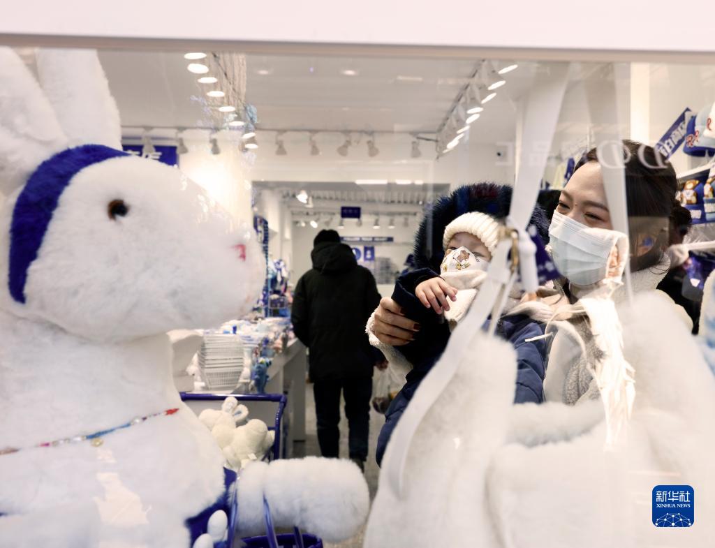 1月27日,游客被北京南鑼鼓巷一家店鋪的毛絨兔子玩具吸引。
