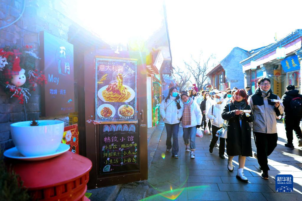 1月27日,游客在北京南鑼鼓巷游覽、品美食。