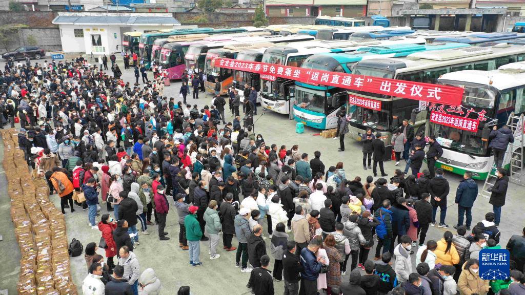1月27日,返崗務(wù)工人員在黔西南布依族苗族自治州安龍縣客車(chē)站準備上車(chē)(無(wú)人機照片)。