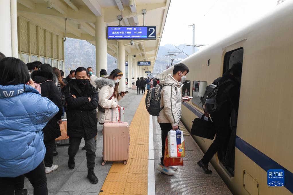 1月24日,在遵義市桐梓縣桐梓東站,外出務(wù)工人員排隊登上列車(chē)。