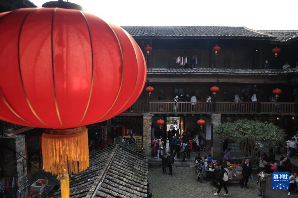 1月25日,游客在福建省龍巖市永定區土樓景區游玩。