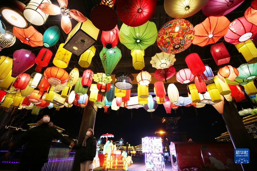1月27日晚,游客在山東省郯城縣郯國古城景區觀(guān)看花燈。