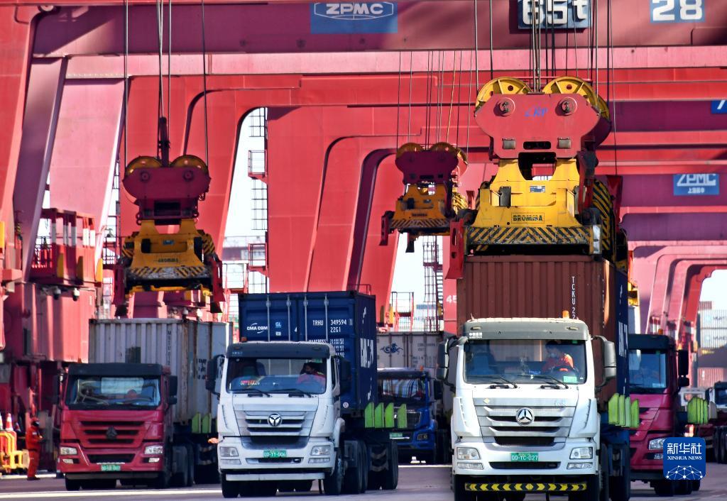 1月27日,在青島港前灣集裝箱碼頭,貨車(chē)在運送集裝箱。