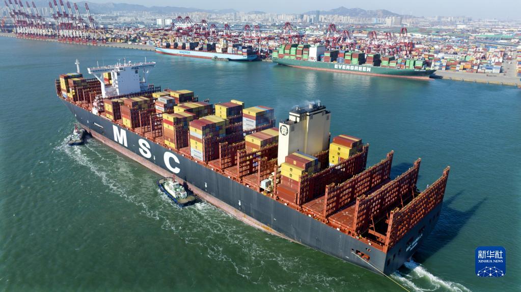 1月27日,一艘集裝箱貨輪緩緩駛入青島港前灣集裝箱碼頭(無(wú)人機照片)。