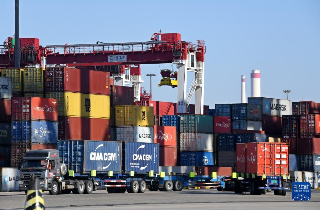 1月27日,在青島港前灣集裝箱碼頭,貨車(chē)在運送集裝箱。