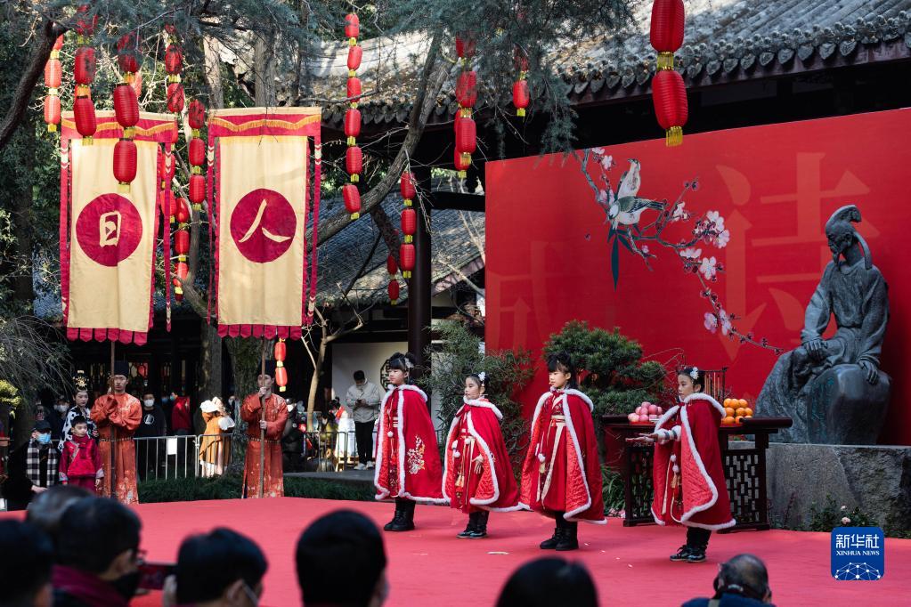 1月28日,在四川成都舉行的“人日”游草堂、祭拜詩(shī)圣杜甫活動(dòng)現場(chǎng),草堂小學(xué)的學(xué)生代表誦讀杜甫詩(shī)。