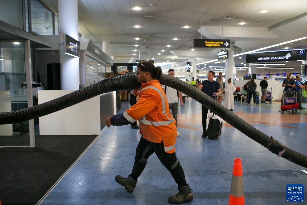 1月28日,工作人員在新西蘭奧克蘭國際機場(chǎng)清理候機大廳積水。
