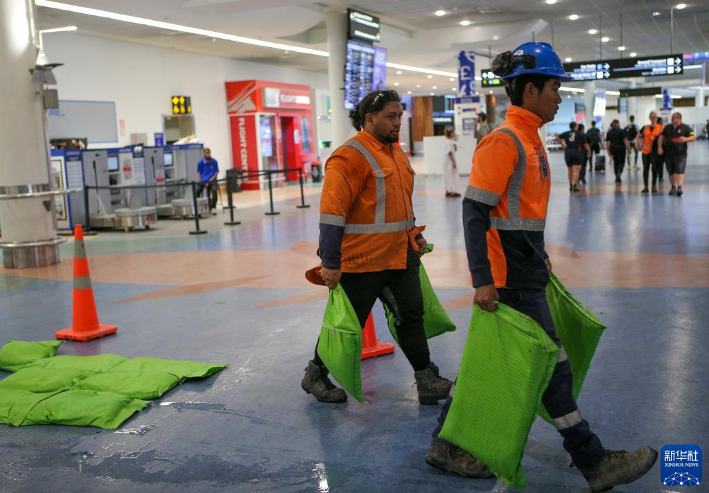 1月28日,工作人員在新西蘭奧克蘭國際機場(chǎng)清理候機大廳積水。