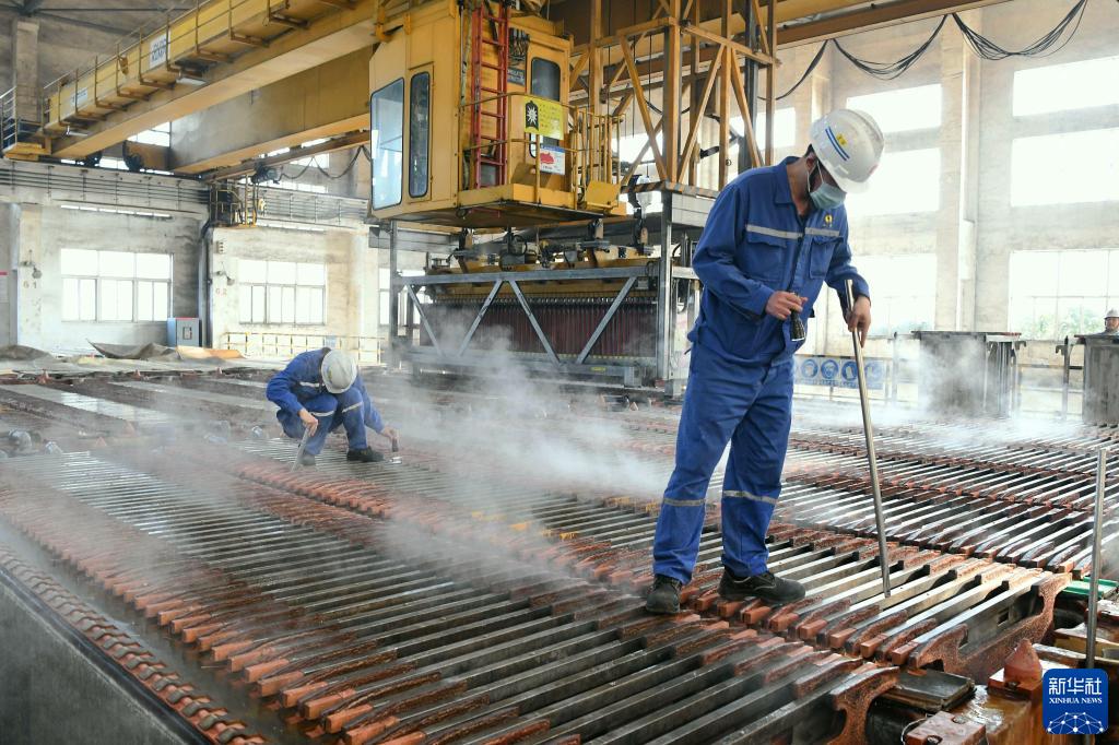 1月28日,工人在安徽銅陵有色金屬(集團)公司金隆銅業(yè)有限公司電解車(chē)間生產(chǎn)電解銅。